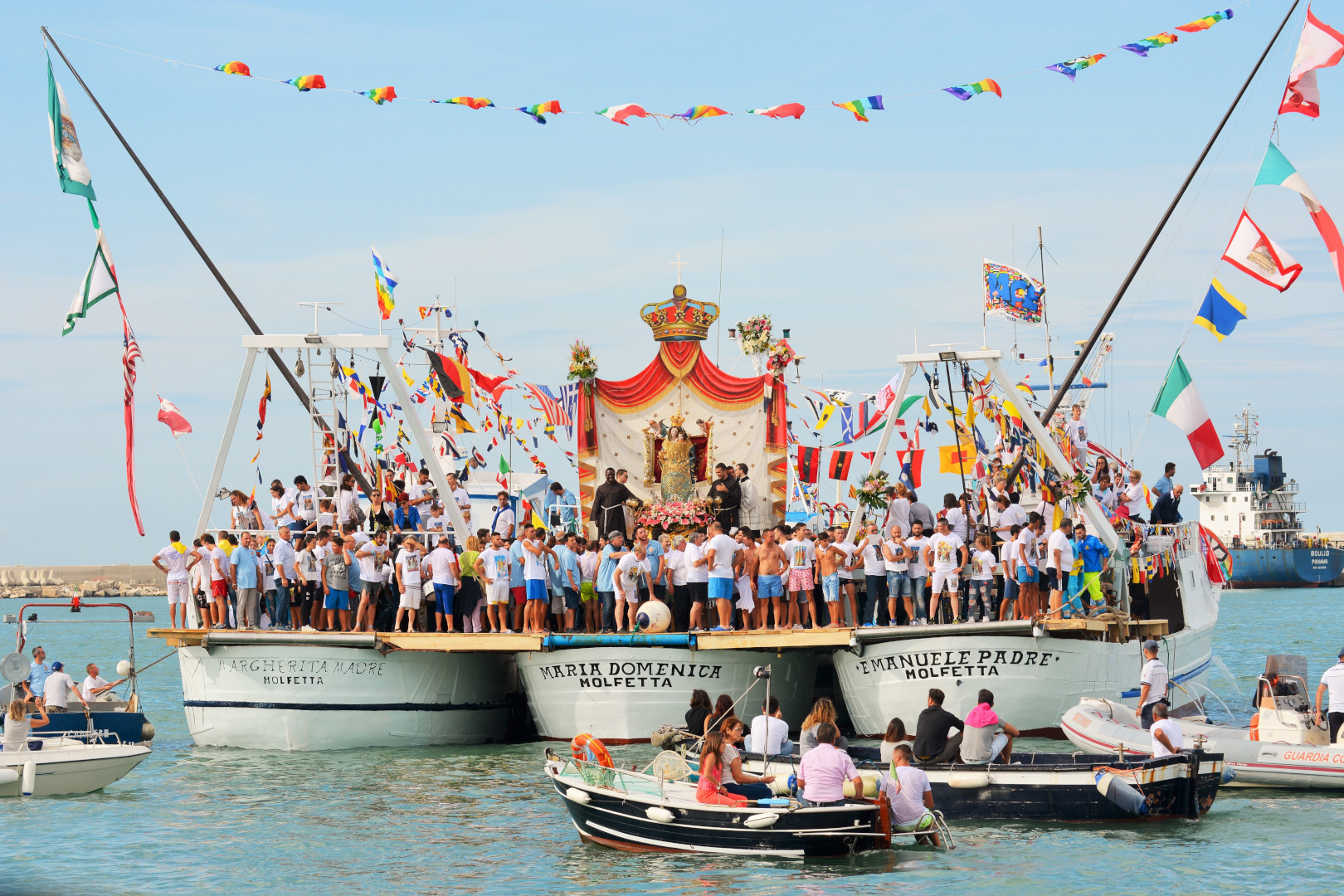 L’8 settembre è poi il giorno della sagra a mare. Le tre imbarcazioni, unite tra loro, sono decorate con bandiere, gran pavese, pennoni e orifiamme e qui siedono i proprietari, i fedeli, i ministranti, la bassa banda di Molfetta e anche gli “irriducibili” del bagno a mare che, per devo zione, ogni anno si tuffano proprio dalle imbarcazioni che guidano il corteo. A queste, si accoda un largo seguito di natanti e pescherecci, con urla di sirene e fuochi pirotecnici a pelo d’acqua. Un momento di euforia collettiva che rievoca i tempi in cui dalla costa adriatica si salpava per partire nelle Crociate, ma anche per ricordare viaggi della speranza più recenti, quelli dei tanti emigranti meridionali che hanno preso la nave per cercare fortuna in tutto il mondo. Sono in tanti, infatti, quelli che a Molfetta vi ritornano proprio a settembre, in occasione della festa patronale.