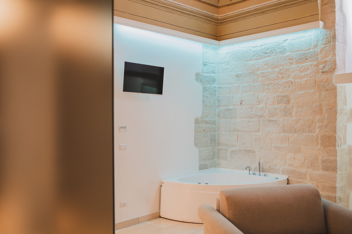 La suite, arredata con cura per ogni minimo dettaglio e provvista di una vasca idromassaggio, rappresenta la scelta ideale per vivere un'esperienza notturna da sogno.